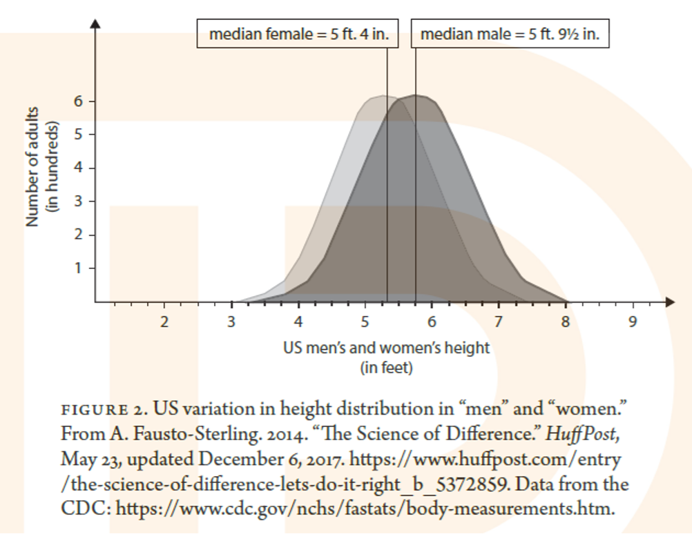 By way of response, yes, Binary View 2.0 is no doubt false. But who would say otherwise? Some males and females are the same height, the same weight, have the same hormone levels, have similar patterns of body hair, etc. For at least some sex-linked traits, plotting the distributions of males and females would result in a bimodal distribution, as we see in Fuentes’ Figure 2 on page 75: