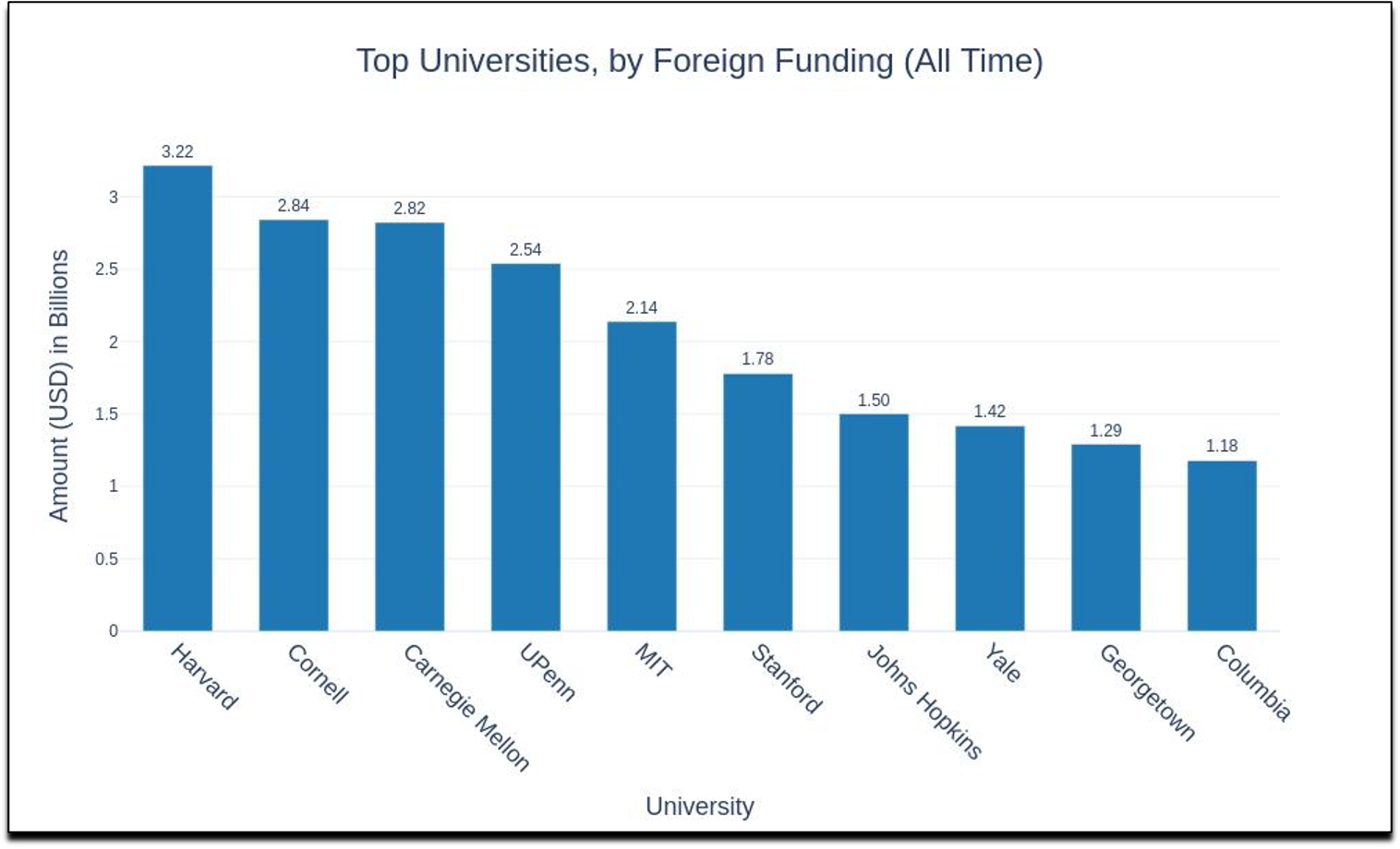 Even more alarming, yet perhaps unsurprising, the institutions that received the most foreign funding shared tremendous overlap with those engulfed in antisemitism scandals: Harvard University, Cornell University, Carnegie Mellon University, University of Pennsylvania, Stanford University, Johns Hopkins University, Yale University, Georgetown University, and Columbia University.