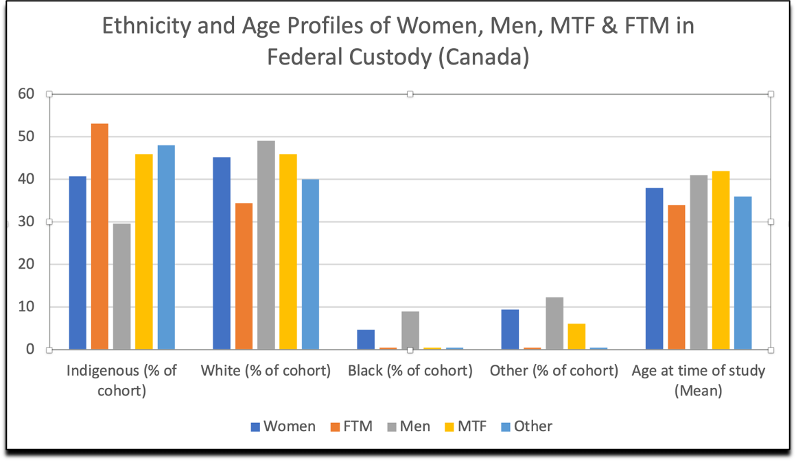 Although a full demographic analysis of criminality is beyond the scope of this paper, some patterns are worth highlighting. A striking 57.1 percent of transmen and 43.3 percent of transwomen in the dataset were Indigenous—despite Indigenous people comprising only about 4 percent of the Canadian population. Furthermore, 61.9 percent of transmen and 72.1 percent of transwomen reported histories of childhood abuse.