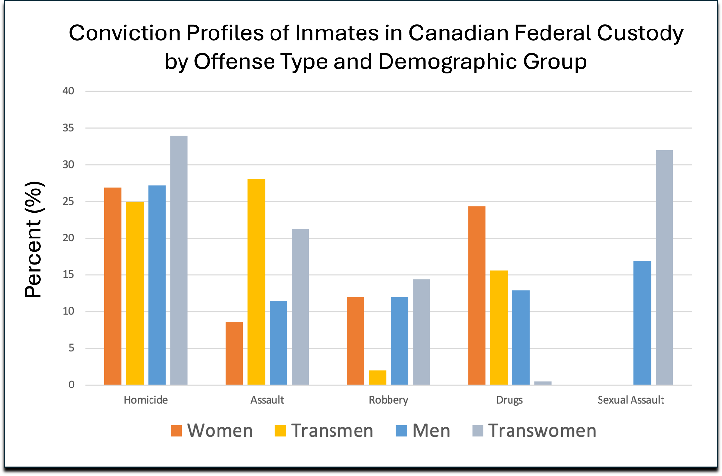 The charts below visualize conviction profiles based on Correctional Service Canada reports, breaking down assault and sexual assault convictions of women, men, transmen (female), and transwomen (male). For context, the first chart presents the overall proportion of inmates: men make up the vast majority (94 percent) of the incarcerated population, and among the “gender diverse” group, 61.6 percent were transwomen. Trans-identified inmates overall represent approximately 1 percent of the inmate population.