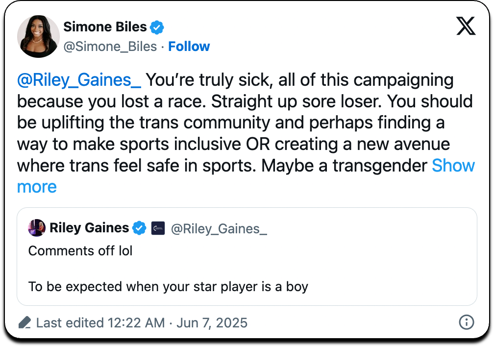 Biles fired back on X, accusing Gaines of bitterness and transphobia: “You’re truly sick, all of this campaigning because you lost a race. Straight up sore loser.” She continued, urging Gaines to uplift the trans community and suggesting, “Maybe a transgender category in ALL sports!!” In a follow-up post, Biles added, “Bully someone your own size, which would ironically be a male.”