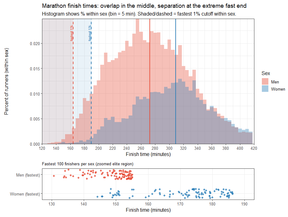 The top panel shows the full population. Each bar represents the percentage of runners within each sex who finished in a given time range. The solid lines mark the median—the “typical” runner.