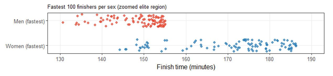 To illustrate this, I pulled a large public marathon dataset and plotted men’s and women’s finishing times.